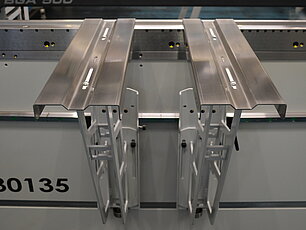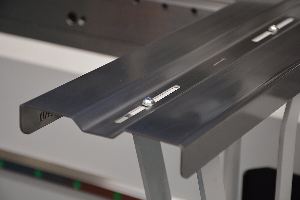 Motorische Auflagearme folgen dem Blech nach oben während der Kantung. Ist der Zielwinkel erreicht, übernimmt das Biegefolgesystem das Blech und führt es vorsichtig in die Horizontale zurück. Das System unterstützt den Bediener bei schweren Blechteilen.