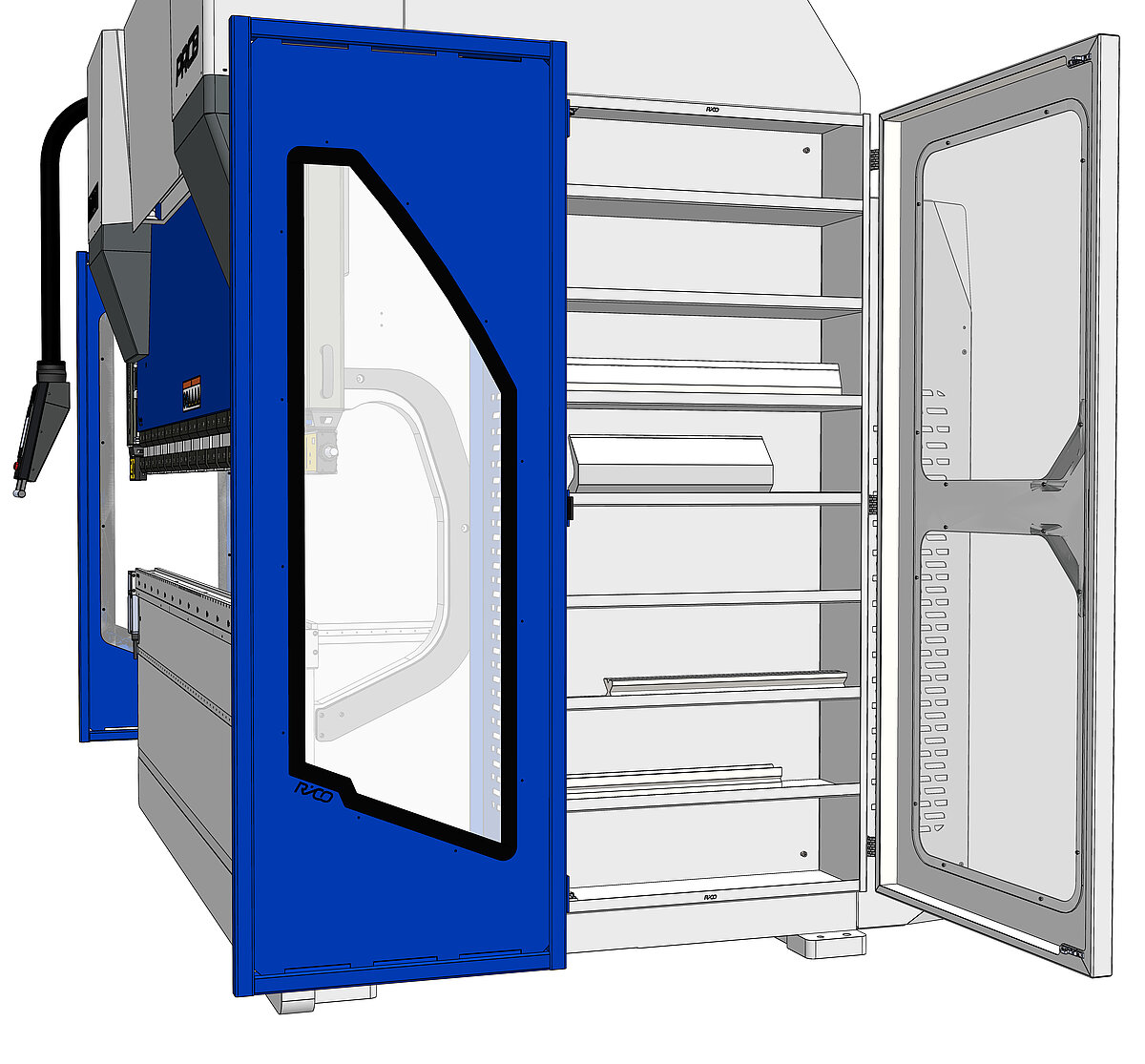 Für ein einfaches, maschinennahes Handling kann die Abkantmaschine PRCN mit einem integrierten Werkzeugschrank ausgestattet werden. Seitlich am Maschinenständer können Sie hier Abkantwerkzeuge lagern. Der Werkzeugschrank verfügt wahlweise über 4 oder 8 Fächer.