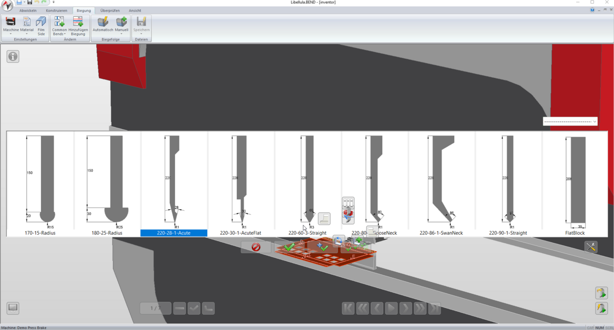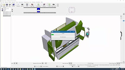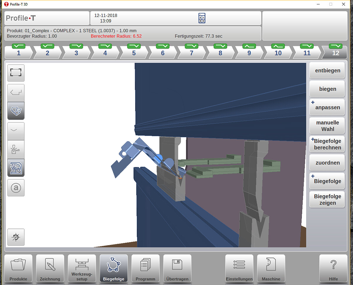 Eine grafische Programmierung des Produkts zeigt eine maßstabsgetreue Darstellung der vorgesehenen Biegung. Eine realistische Produktvisualisierung gibt Feedback zur Machbarkeit, zu Kollisionen sowie zu den für die Fertigung benötigten Werkzeugen und Werkzeugadaptern.
