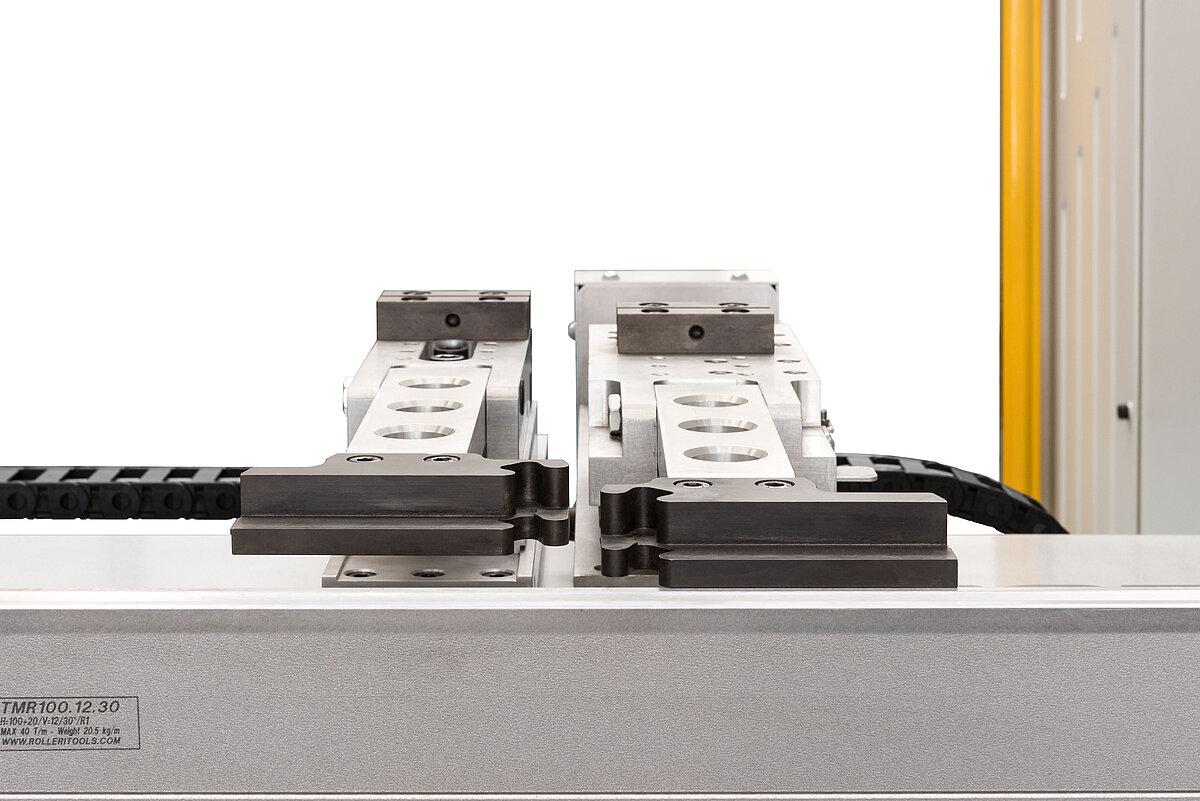 Zusätzliche Anschlagnocken in seitlicher T-Nut der Arme als vorderer Anschlag für das eingelegte Blech.