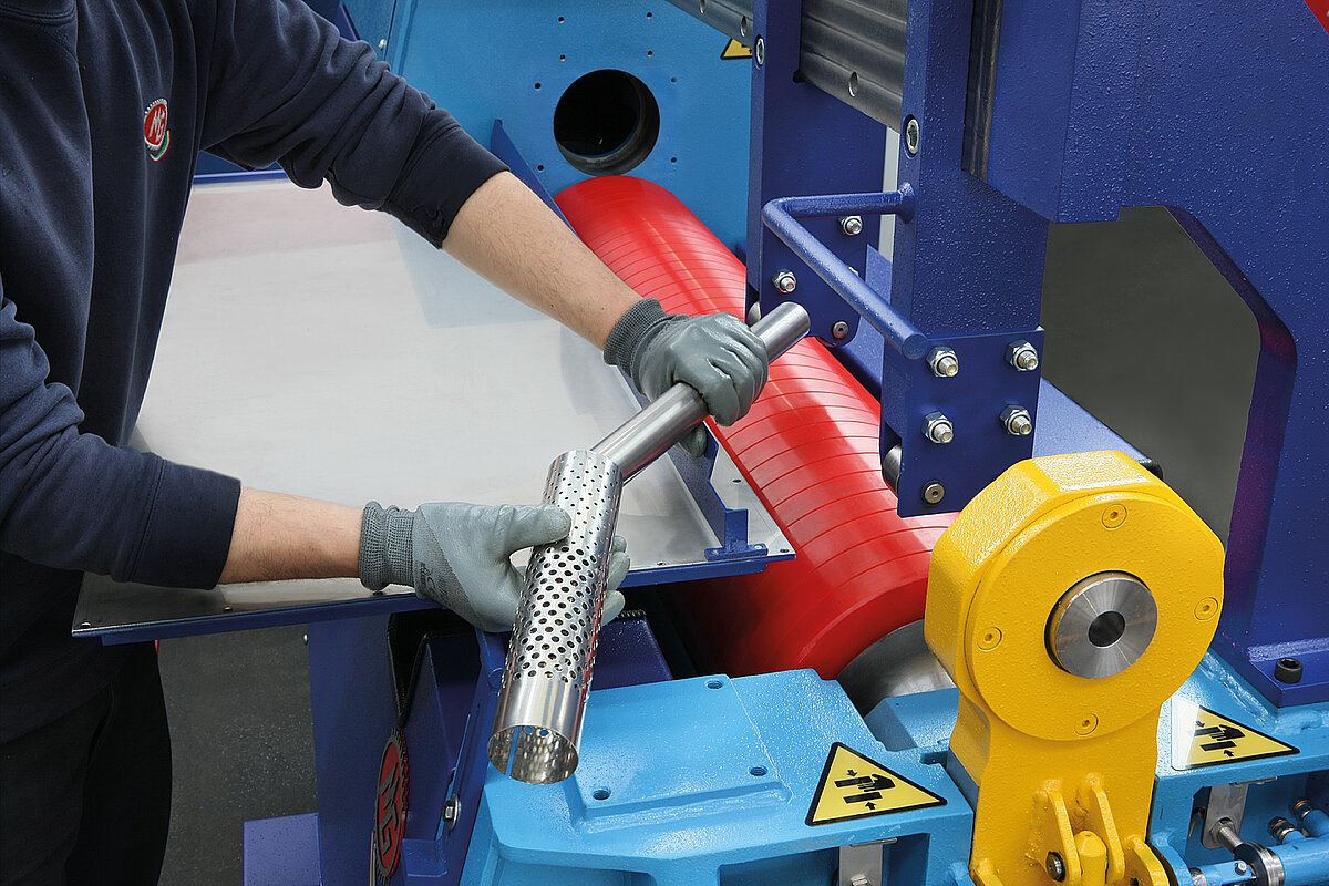 Die Oberwalze der 2-Walzen Blechrundbiege Hezinger BendLine MG2R ist das Radiuswerkzeug, mit dem das Blech in die Gummierung der Unterwalze, die als Matrize dient, eingedrückt wird. Durch den Rotationsvorschub wird das Blech auf komplettem Werkzeugstückmantel geformt. Je nach Zieldurchmesser wird ein entsprechend angepasster Oberwalzendurchmesser benötigt. Dabei können Sie die Oberwalze der 2-Walzen Blechrundbiege von Hezinger bequem und zeitsparend über ein spezielles Schnellwechselsystem austauschen. So können Sie mit der Hezinger BendLine MG2R auch unterschiedliche Durchmesser fertigen.
