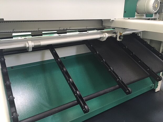 - Ablegen nach vorne für Abschnitt-Längen von 250 mm bis 750 mm, der Abschnitt kann von vorne unter dem Schneidtisch entnommen werden