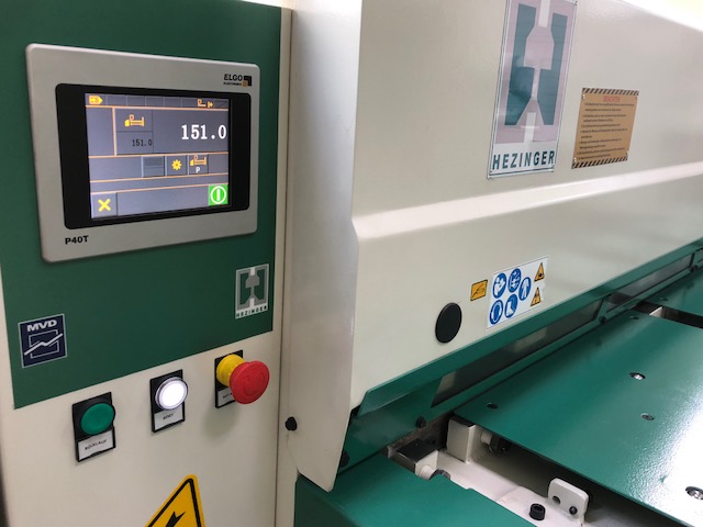 Die Schnittspalt-Einstellung erfolgt bei der Hezinger Motorschere manuell beidseitig, bequem von vorne. Über die programmierbare Steuerung mit farbigem TouchScreen lässt sich der NC-Hinteranschlag auf Kugelrollspindeln automatisch steuern. Dabei arbeitet die Hezinger Motorschere mit einer Positioniergenauigkeit von ± 0,1 mm. Der Schnitt der Maschine wird sicher und komfortabel über einen Fußschalter gesteuert.