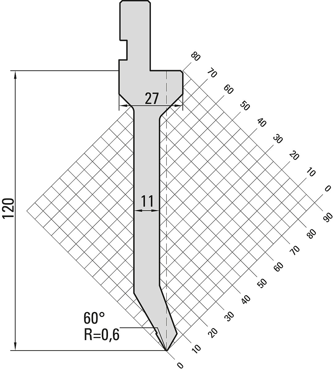 60° Oberwerkzeug "Fixed Height", R=0,6mm, H=120mm, B=27mm, L=800mm sektioniert in