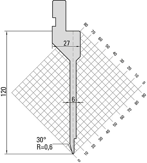 30° Oberwerkzeug "Fixed Height", R=0,6mm, H=120mm, B=27mm, L=800mm sektioniert in
