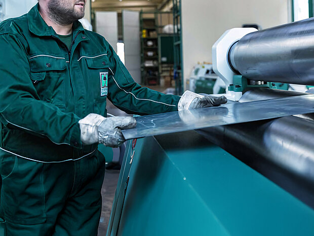 In der unteren Ausgangslage sind die Seitenwalzen näher an der Unterwalze – es können also kürzere Abwicklungen für beispielsweise Kreis-Segmente bearbeitet werden.