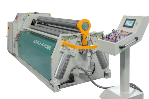 Die Rundwalze Hezinger HR4W biegt Werkstücke in einer Biegelänge von 1.550 bis 4.100 mm. Beim Walzvorgang presst die obere Walze auf das Objekt, welches von den unteren Walzen geklemmt wird. Pressdruck wie Abstand der Walzen bestimmen das Endergebnis. Dabei gibt die hydraulische Oberwalze der Rundwalze die Kraft gleichmäßig auf das zu biegende Metall ab.