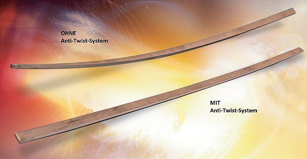 Das Anti-Twist-System wirkt diesen Verformungen entgegen, indem es das Blech während des Schneidvorgangs stabilisiert. Eine Vielzahl hydraulischer Stempel drückt beim Schneiden von unten gegen den Blechstreifen und verhindert so das Herunter-Biegen nach unten.