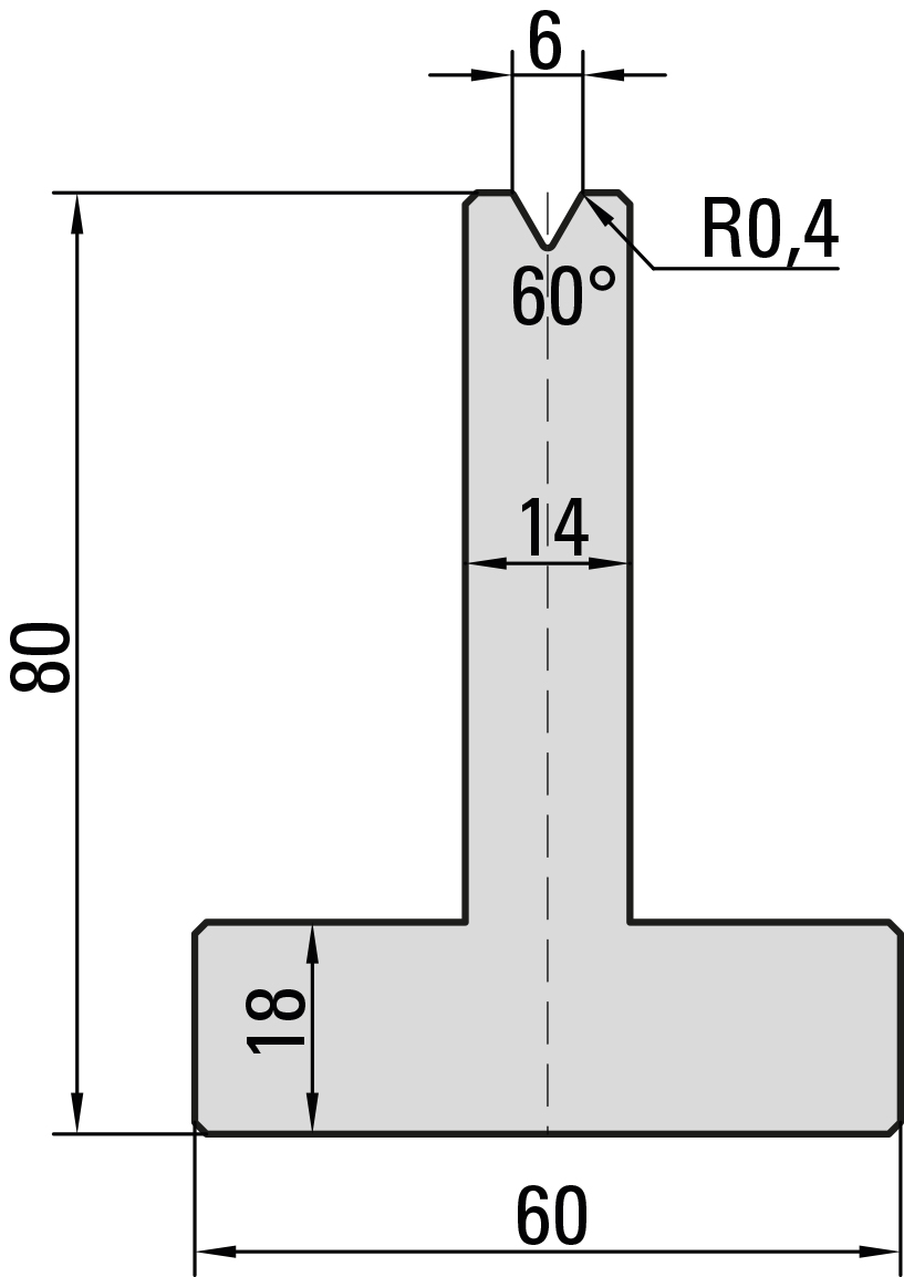 60° T-Matrize, V=6mm, R=0,4mm, H=80mm, B=14mm, L=415mm, UKB-System Amada