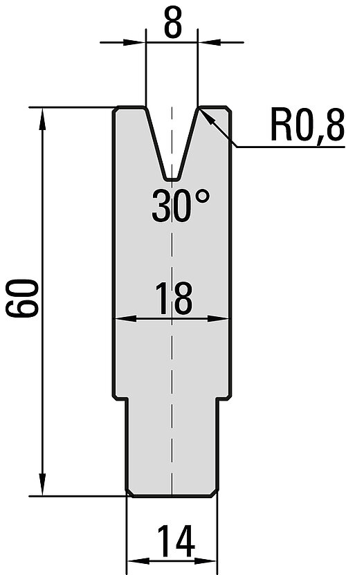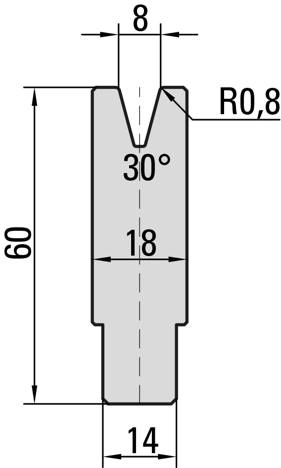 30° Zentrische 1-V Matrize, V=8mm, R=0,8mm, H=60mm, B=18mm, L=800mm