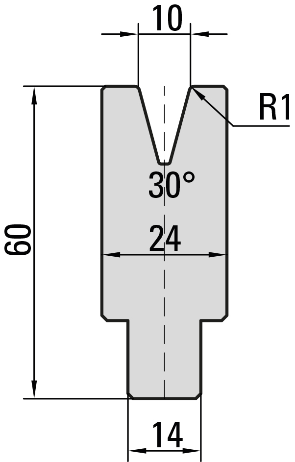 30° Zentrische 1-V Matrize, V=10mm, R=1,0mm, H=60mm, B=24mm, L=800mm