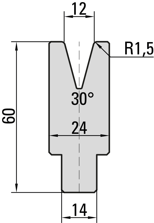 30° Zentrische 1-V Matrize, V=12mm, R=1,5mm, H=60mm, B=24mm, L=800mm