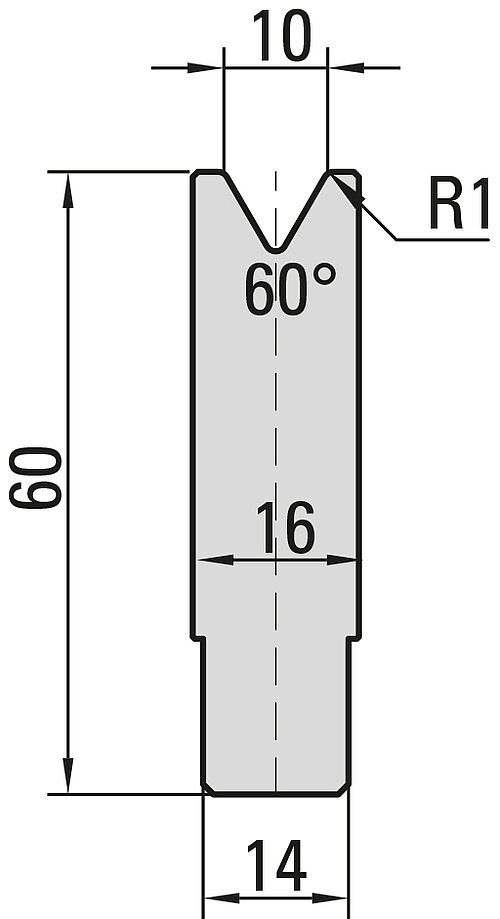 60° Zentrische 1-V Matrize, V=10mm, R=1,0mm, H=60mm, B=16mm, L=415mm,