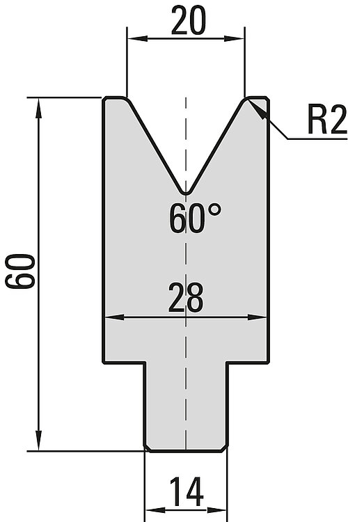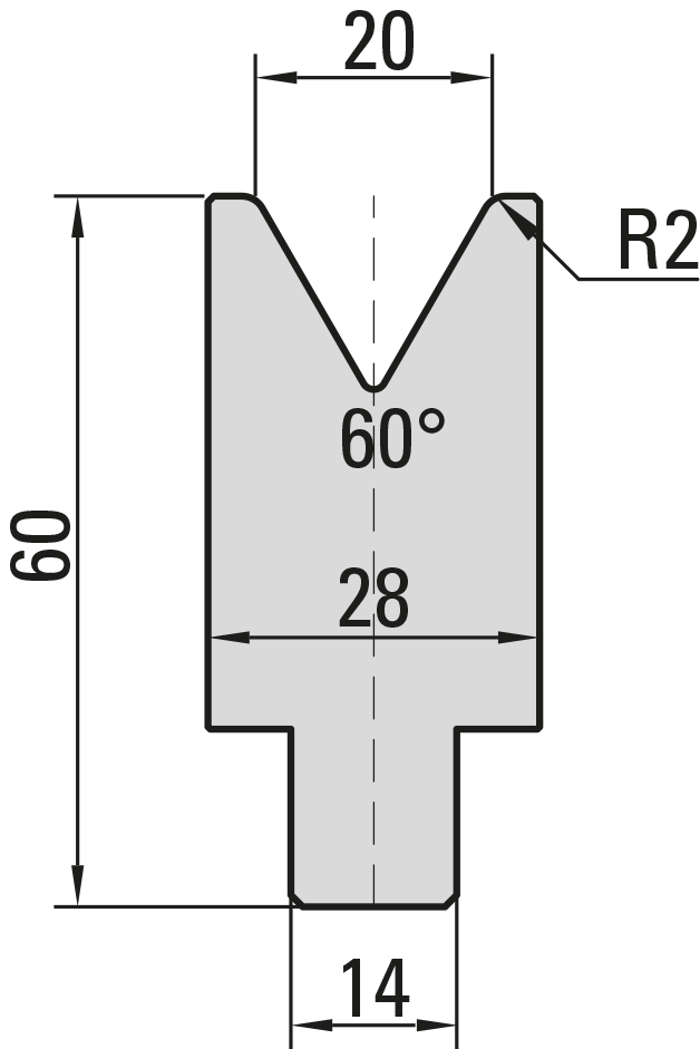 60° Zentrische 1-V Matrize, V=20mm, R=2,0mm, H=60mm, B=28mm, L=800mm
