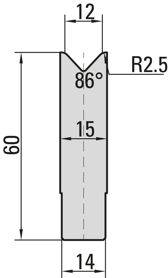 86° Zentrische 1-V Matrize, V=12mm, R=2,5mm, H=60mm, B=15mm, L=800mm