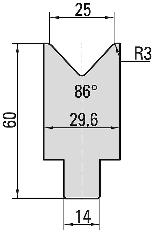 86° Zentrische 1-V Matrize, V=25mm, R=3,0mm, H=60mm, B=29,6mm, L=415mm,