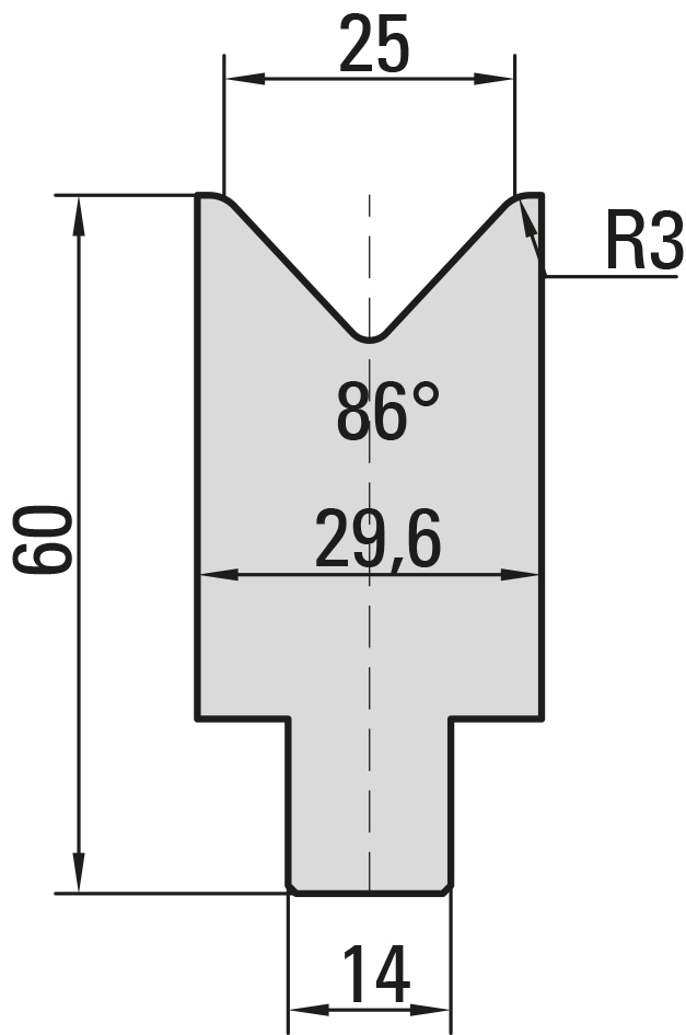 86° Zentrische 1-V Matrize, V=25mm, R=3,0mm, H=60mm, B=29,6mm, L=800mm