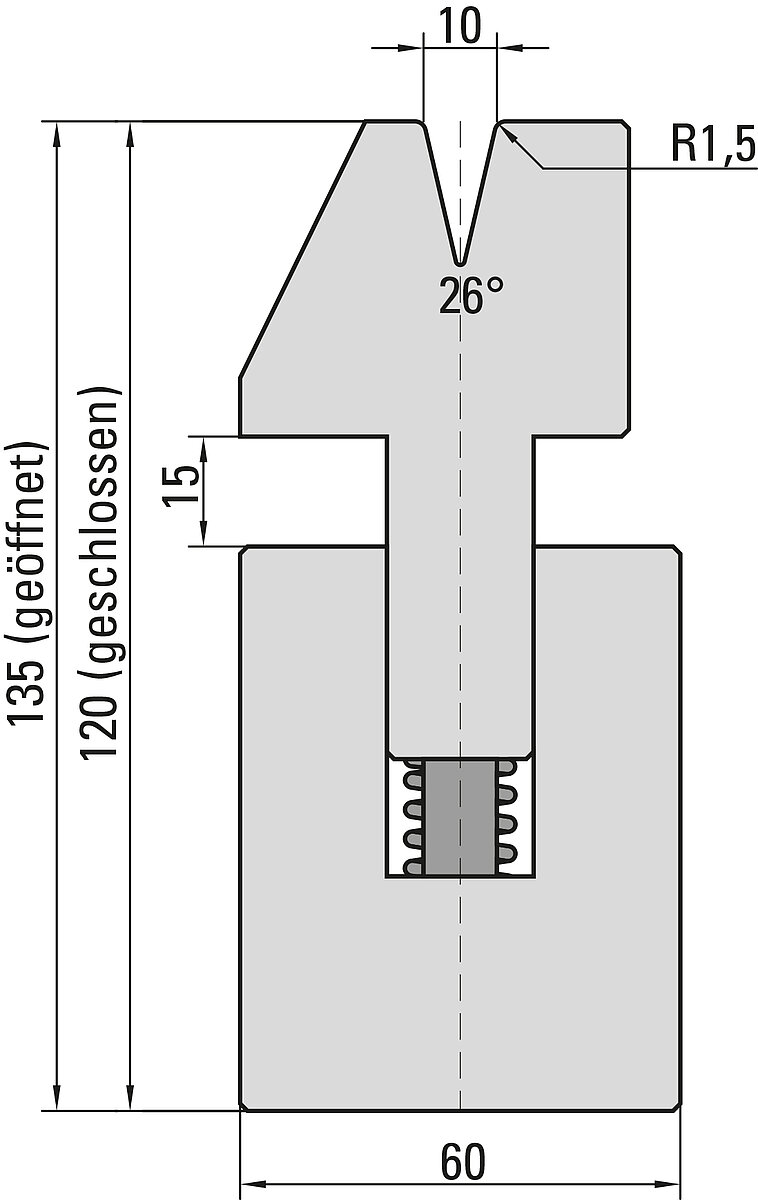 26° Federgelagerte Zudrückmatrize, V=10mm, H=120/135mm, B=60mm, L=415mm,